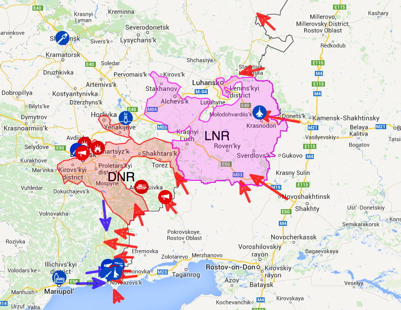 The following two maps are from sources supporting opposite sides in the conflict, but they agree on one thing, which is that pro-Russian or Russian forces are threatening to encircle the Ukrainians from the north and south (note, however, that the first (Russian) map does not have the offensive in the south originating in Russia).