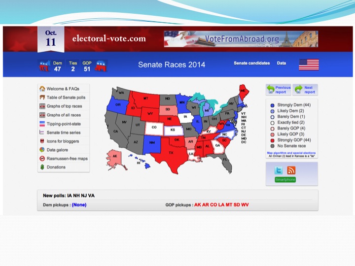 Clearly, then, Obama’s low approval ratings will help Republicans in the upcoming congressional elections. The Republicans will certainly retain control of the House of Representatives and will very likely add a few seats to their current majority, albeit not many. That won’t make much difference politically, however, because the Republicans have a majority in the House already. What would matter more would be if the Democrats lose control of the Senate, which now seems very likely. On-line betting services last week had Republicans as 70% favorites to win control of the Senate in November. They put the probability of a tie at around 10%, which would in practice be a win for the Democrats because the vice president breaks tie votes, and the probability of an outright Democratic majority at around 20%. As Slide 2 suggests, the likelihood is that, unless something unexpected happens, the Republicans will win at least 51 seats, and perhaps a few more.