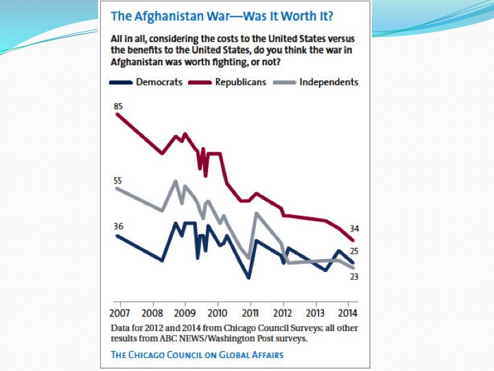 Slide 4 shows support for the war in Afghanistan has also declined dramatically since 2007, and particularly among Republicans – from 85% in 2007 to 35% today.