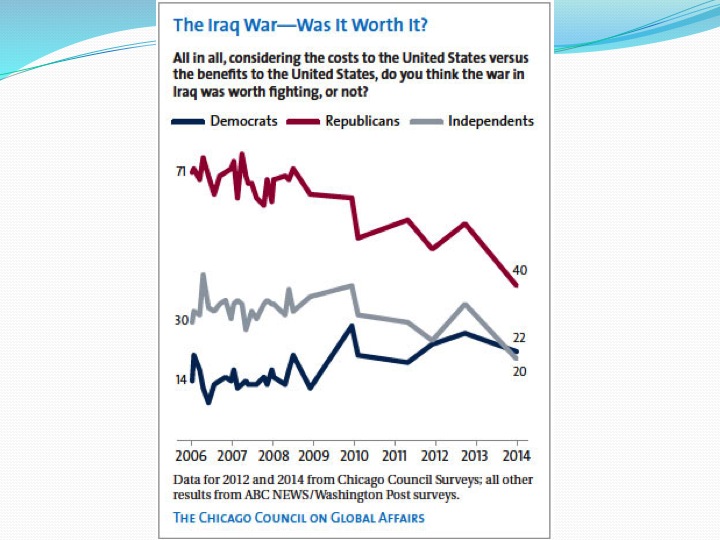 And support for the war in Iraq has also declined, as shown in Slide 5, and again most dramatically among Republicans.