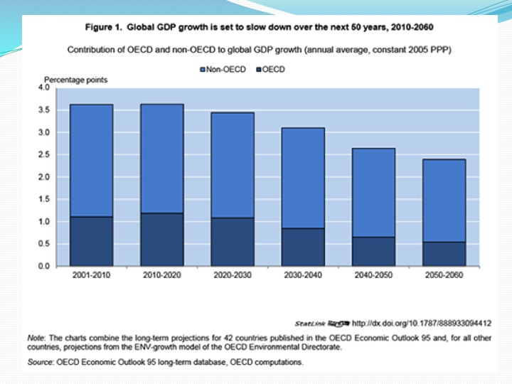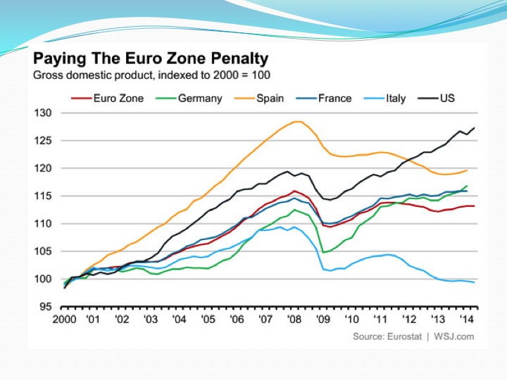 While the US has been recovering slowly and fitfully since 2009, Europe has been essentially stagnated. Total output in some key EU countries has yet to recover to where it was in 2008. Most important politically, however, is Europe’s debilitating and divisive unemployment problem, which as shown in Slide 10, is truly acute. Unemployment in the EU as a whole is a little over 10%. But what makes employment so divisive politically is that it is not evenly distributed by country. Unemployment in Greece is 27%, while in Spain it is 24%. In Germany, by contrast, it is around 5%, although that figure masks some “underemployment” – that is, Germany has a lot more part-time workers without full benefits and secure employment than it used to. Moreover, as shown in the next slide, German growth is stalling.