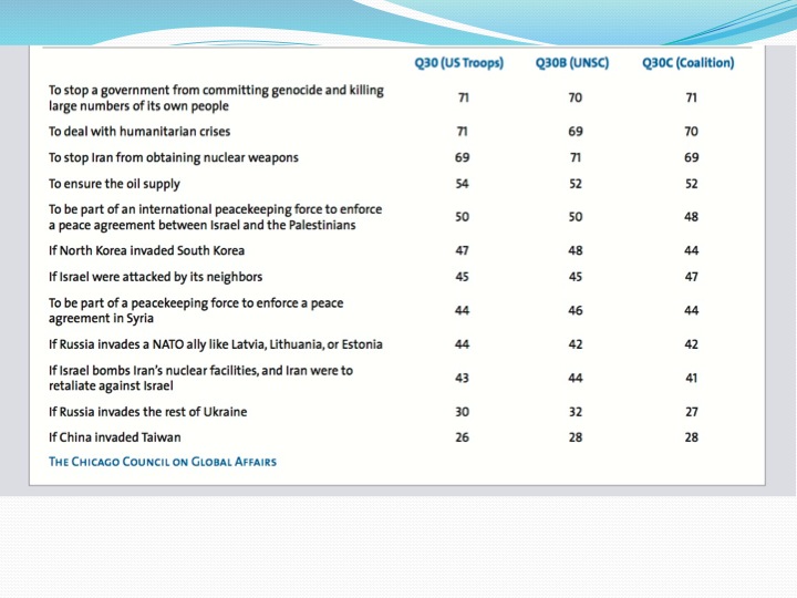 It shows public support for U.S. military action, with the first column being unilateral military action, the second being military action with UN Security Council authorization, and the third being military action as part of a coalition. As you can see, support for humanitarian intervention – the first two lines – is quite high. Support for the use of force to stop Iran from obtaining nuclear weapons is also relatively high. There is rather less support for using force to ensure the supply of oil. Well down the list is support for military action if Russia were to invade the Baltic states, which as you know are NATO members. In fact, I suspect that most Americans are not aware that the Baltic states are our NATO allies, that we are legally obligated, more-or-less, to come to their defense if they are attacked under Article 5 of the NATO treaty, and that these very small states that share borders with Russia are extremely vulnerable militarily. Finally, note that only 30% of Americans support military assistance to Ukraine if Russia invades the rest of the country.