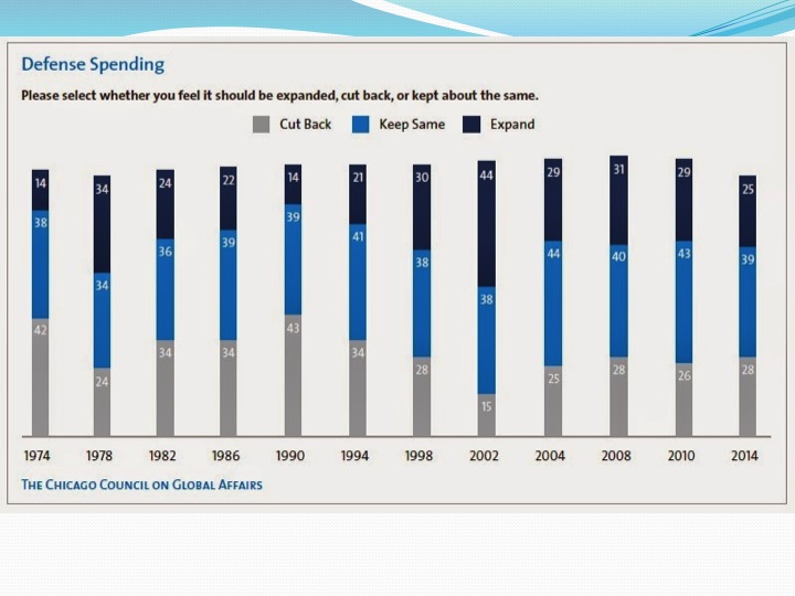 Public skepticism about U.S. foreign policy activism was highlighted in a recent survey by the Chicago Council of Global Affairs. As shown in Slide 3, the percentage of Americans who think the U.S. should take “active part” in world affairs has declined from 71% after September 11 to 58% in 2014.