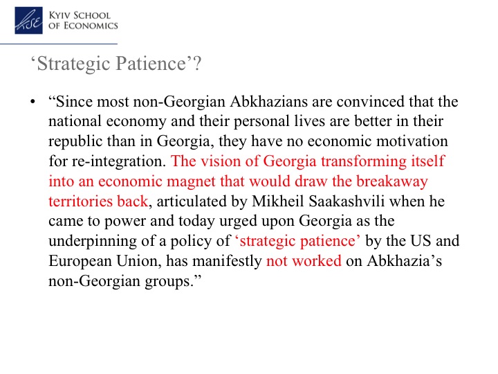 Also, while I quite agree with Tom that the evidence does not suggest that “strategic patience” works very well – that is, the hope in the national capitals that economic growth will eventually lead economically isolated and depressed breakaway regions to seek eventual reunification (see the slide below, also posted with Tom’s permission) – that does not mean that “strategic impatience” will work either.