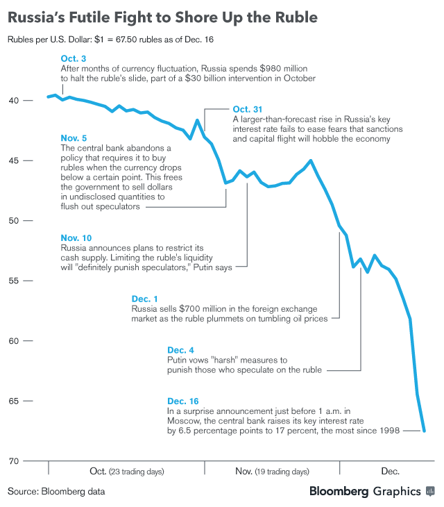 The Russian Central Bank (RCB) has tried to fight the ruble’s fall by intervening in currency markets and raising interest rates. Yesterday, it increased interest rates a dramatic 650 basis points, from 10.5 to 17%, having already increased rates sharply earlier in the year. Its foreign currency reserves, while still substantial, have also been falling, and with large corporate debt obligations denominated in dollars coming due next year, there is increasing talk of possible default by Russian debtors, including major companies that are partially or entirely state owned.