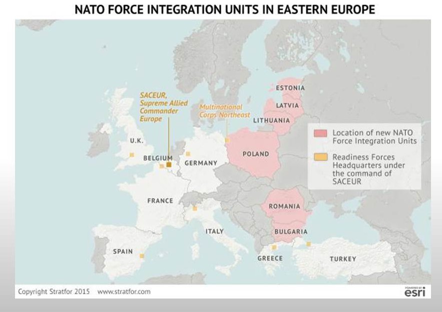 NATO’s overall military strategy is suggested by the next slide. In January, NATO announced plans to establish “NATO force integration units” (NFIUs) in the six eastern flank countries – Estonia, Latvia, Lithuania, Poland, Romania, and Bulgaria.