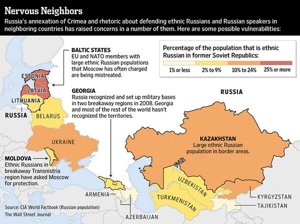 Map (without distribution) of ethnic Russians and Russian speakers in countries bordering on Russia (Source: The Wall Street Journal)